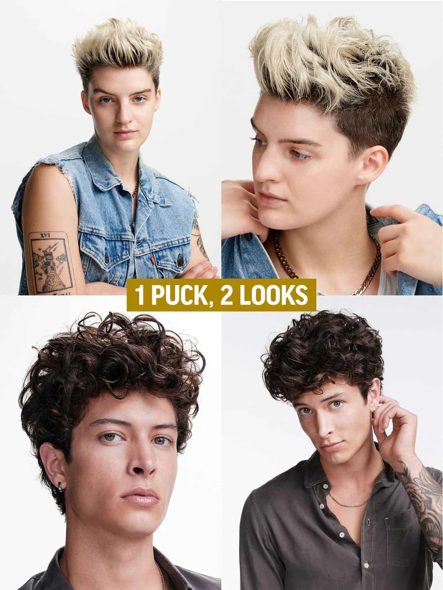 Press into Clay firmly, remove a small amount and rub between palms or fingertips to soften product. Distribute evenly through towel dried hair.
