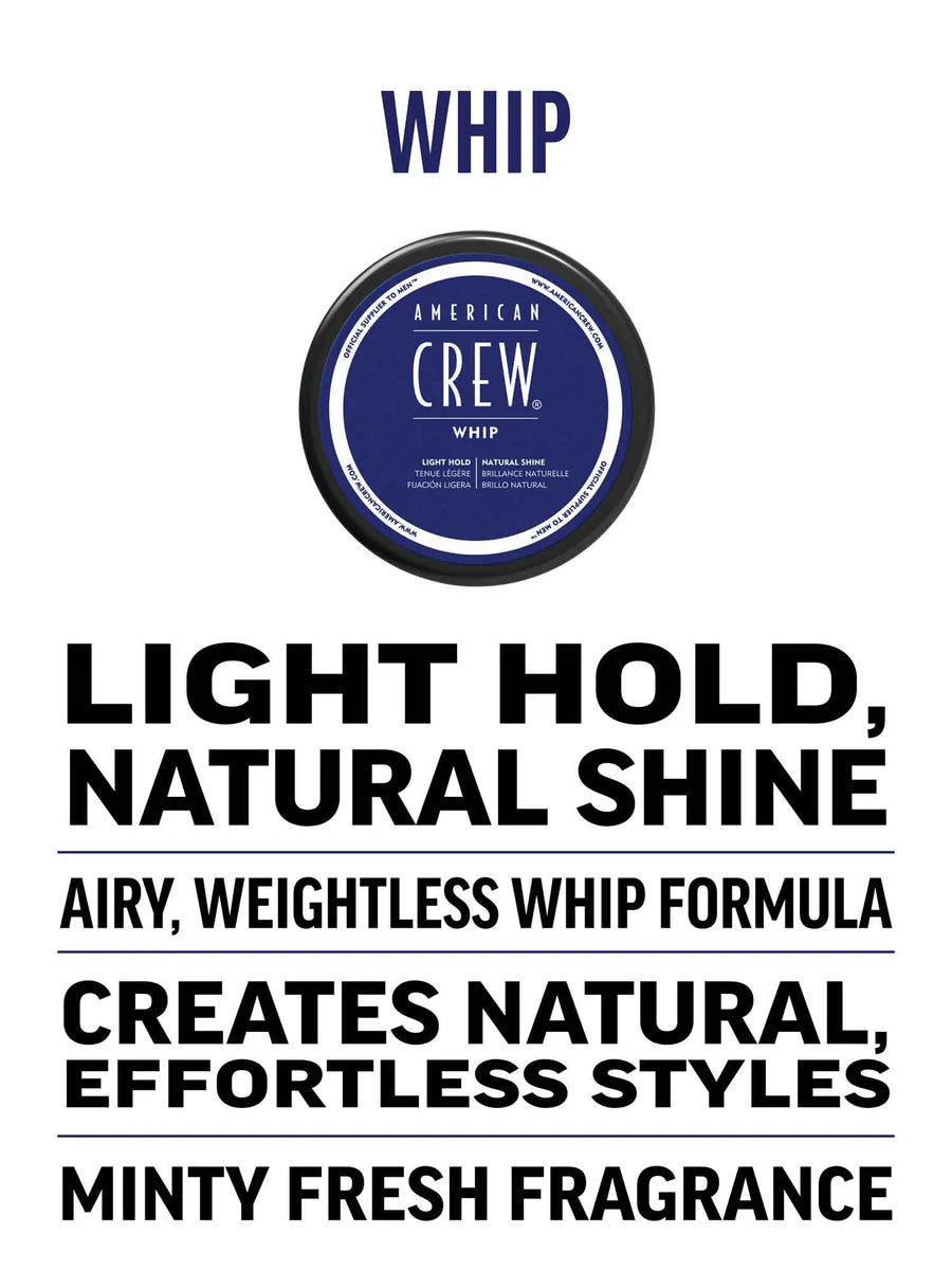 Apply a small amount to palms and emulsify to loosen the whip. Apply evenly through damp or dry hair with fingertips to create soft, pliable hold and separation. Layer and style as needed to achieve desired look.