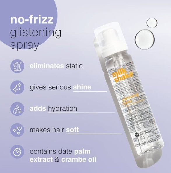 milk_shake glistening spray leaves hair glossy, eliminates static and makes dry hair more manageable. Contains date palm extract and crambe oil for soft, manageable hair and helps maintain optimal hydration. Leaves hair soft, vibrant and shiny.