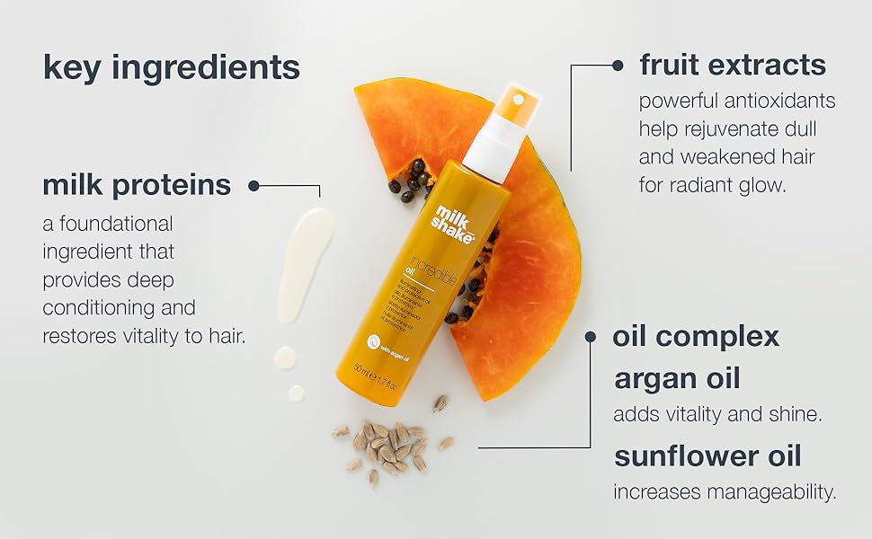 milk_shake incredible oil is a powerful, lightweight hair oil that smooths split ends and creates a radiant finish. The powerful blend of oils help illuminate and strengthen hair to promote softer, shinier hair while protecting color. Can be used before or after styling depending on desired results. Ideal for dull hair in need of softening and shine. milk_shake incredible oil combines the silkening effects of precious argan oils with the protective power of sunflower oil, and hydrating papaya extract, this spray oil is perfectly primed to deliver nourished, illuminated hair. Add shine, protects color and absorbs quickly with no residue. Infused with a luxurious and indulgent vanilla fragrance.